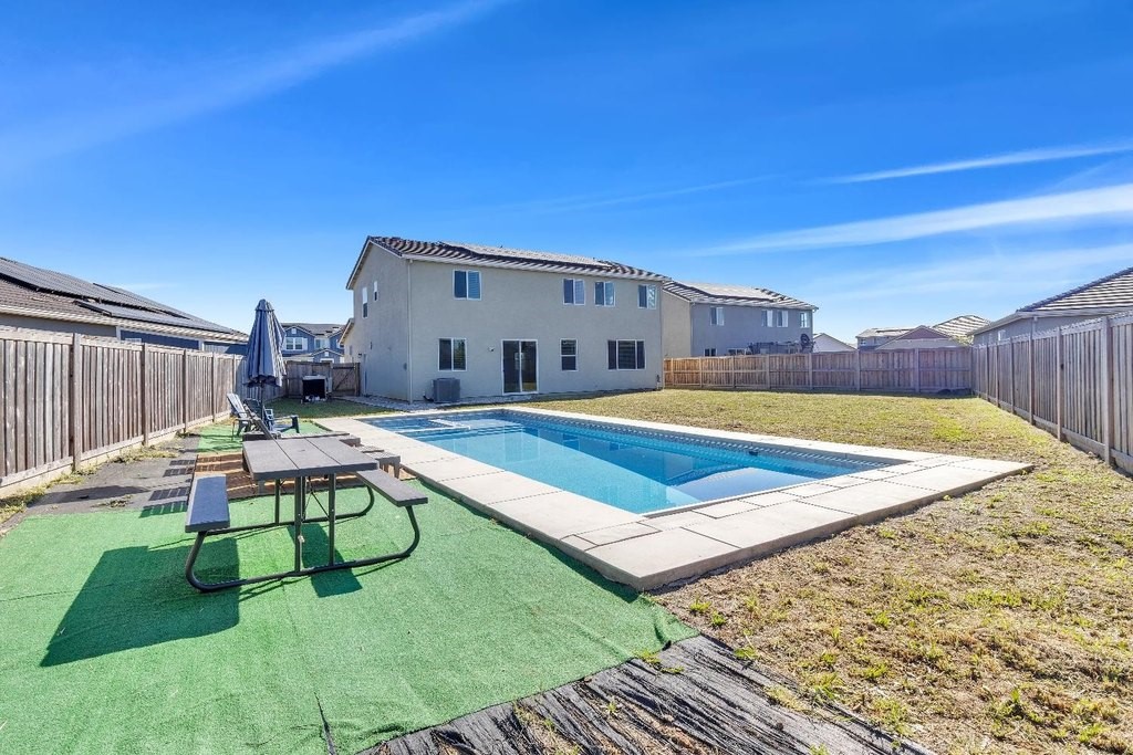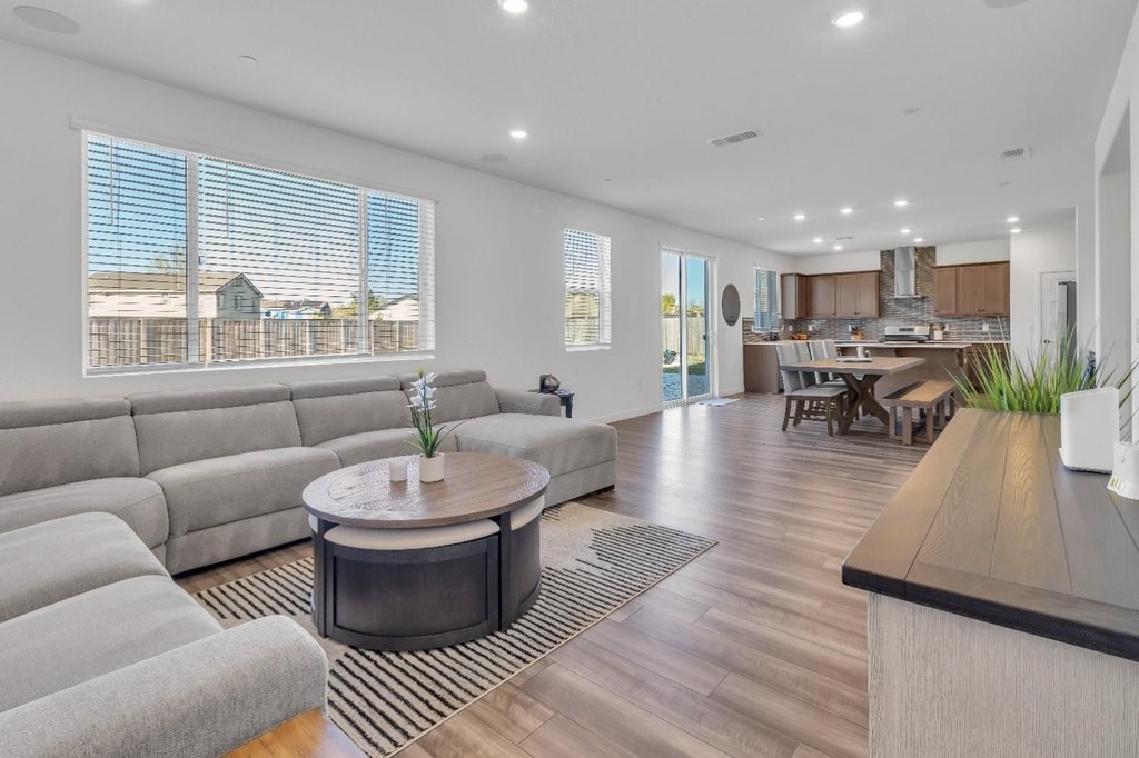 Welcome to this beautiful two story home tucked away in a quiet court in desirable Plumas Lake. Offering five bedrooms, three bathrooms, and a spacious loft, this thoughtfully designed home blends comfort, space, and functionality for modern living. The open concept layout creates an inviting atmosphere filled with natural light and stylish finishes throughout. The kitchen is designed for both everyday living and entertaining, featuring beautiful countertops, stainless steel appliances, extended cabinetry for ample storage, and a built in wine cooler. Vinyl plank flooring flows seamlessly through the main living areas, adding warmth and durability. A full bedroom and bathroom on the first floor provides flexibility for guests, multigenerational living, or a private home office. Step outside to a generous 10,000 square foot lot featuring a newly added heated saltwater pool, creating the perfect setting for summer gatherings, relaxing evenings, and outdoor entertaining. The spacious backyard still offers plenty of room to design your dream outdoor space.